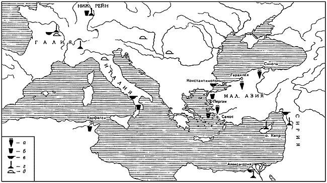 Следующий этап в развитии северочерноморской торговли начинается с конца IV в. до н. э. и охватывает следующие два столетия (III–II вв. до н. э.) и, отчасти I в. до н. э. Значение северопонтийского, в частности, Боспорского хлебного экспорта существенно сокращается. На первый план выдвигаются товары, перечисленные Полибием и Страбоном (скот и продукты скотоводческого хозяйства, рыба, отчасти рабы) (в отношении рабов см.: Гольденберг В.А., 1953; с. 206; Гайдукевич В.Ф., 1949а, с. 501), хотя Северное Причерноморье продолжало оставаться важным зерновым районом античного мира. Значение хлебных ресурсов Боспора отчетливо вытекает из сообщения Страбона (VII, 4, 6) о том, что население Крыма и Таманского полуострова ежегодно выплачивало Митридату Евпатору дань в размере 180 тыс. медимнов хлеба. В эпоху эллинизма в средиземноморской торговле Северного Причерноморья на первый план снова выдвигаются малоазийские и, особенно, островные центры. Наиболее значительным был импорт вина из Родоса, засвидетельствованный повсеместными находками родосских амфор (табл. LXIX), которые почти все без исключения клеймились. По количеству находок родосские клейма в Северном Причерноморье уступают лишь синопским (о родосских клеймах см.: Леви Е.И., 1964а, с. 227 сл.; Шелов Д.Б., 1975, с. 10 сл.). Однако соотношение амфорных клейм не отражает истинного соотношения импорта различных центров, поскольку само соотношение клейменой и неклейменой тары в них было различным (Кругликова И.Т., 1972б; Брашинский И.Б., 1977). Неточно отражает истинное соотношение объема импорта из различных центров и соотношение количества самих амфор из-за существенных отличий их стандартных емкостей (Брашинский И.Б., 1976а, с. 87 сл.). Поэтому существующие в настоящее время представления о месте и объеме импорта из различных центров в Северном Причерноморье требуют пересмотра и значительных поправок. Однако, несмотря на все сделанные оговорки, родосский импорт занимал в Северном Причерноморье в III и особенно во II в. до н. э. весьма значительное место. В III и начале II в. до н. э. основной поток его шел в Северо-западное Причерноморье (Ольвия и др.), позднее же на первое место выдвигается Боспор (Шелов Д.Б., 1958). Из других средиземноморских островных центров по амфорам и керамическим клеймам повсеместно в городах Северного Причерноморья фиксируется импорт из Коса, Пароса, Икоса, а также Книда, наиболее значителен косский, хотя и он сильно уступает родосскому (табл. LXIX). Значительное место в импорте керамики в это время принадлежит Делосу (так называемые «мегарские» чаши и т. д.), Пергаму и другим малоазийским центрам. Начинается импорт из Александрии (Шургая И.Г., 1965а), шедший, возможно, через посредство Родоса, а также Синопы (Пиотровский Б.Б., 1958). Очень широкое распространение приобретает импорт изделий из египетского фаянса (бусы, амулеты), начало которого относится еще к VI в. до н. э. (Пиотровский Б.Б., 1958; Алексеева Е.М., 1975а, с. 25).