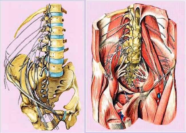 Очевидно, что спинно-мозговые нервы (а не корешки) в поясничном отделе позвоночника выходят из позвоночного канала через соответствующее межпозвонковое отверстие над межпозвонковым диском (МПД), который не может повредить нерв, тем более что МПД «опутан» глубоким слоем околопозвоночных связок. Но хирургически легко повредить спинно-мозговые нервы и их ветви, пробираясь к МПД).