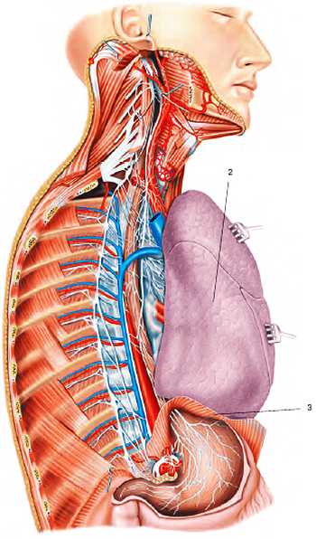 1 – диафрагма; 2 – брюшная полость; 3 – грудная полость