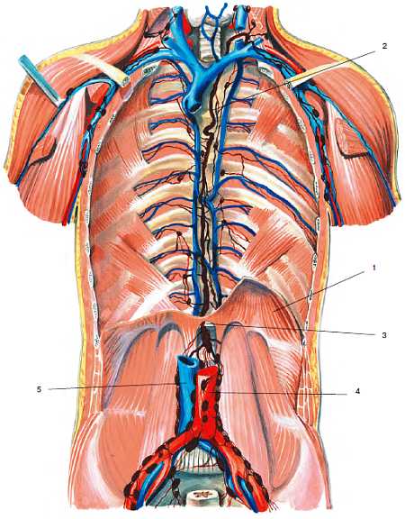 1 – диафрагма; 2 – ребра и межреберные мышцы; 3 – грудная полость; 4 – брюшная полость; 5 – позвоночник