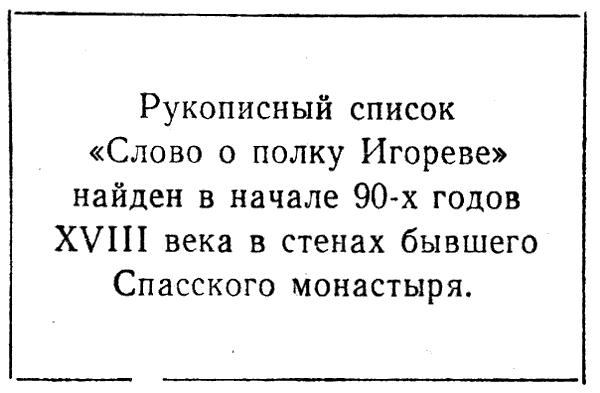 «И здесь следы библиотеки Константина, – подумал я. – Возможно, у Константина был список „Слова“, переписанный на бересте. Триста лет спустя безвестный инок вторично переписал „Слово“, уже на пергаменте. А прошло еще триста лет, и большой любитель старины граф Мусин-Пушкин нашел этот список, а прошло еще двадцать лет, и бесценная подлинная рукопись сгорела во время нашествия французов, когда сгорела вся Москва…»