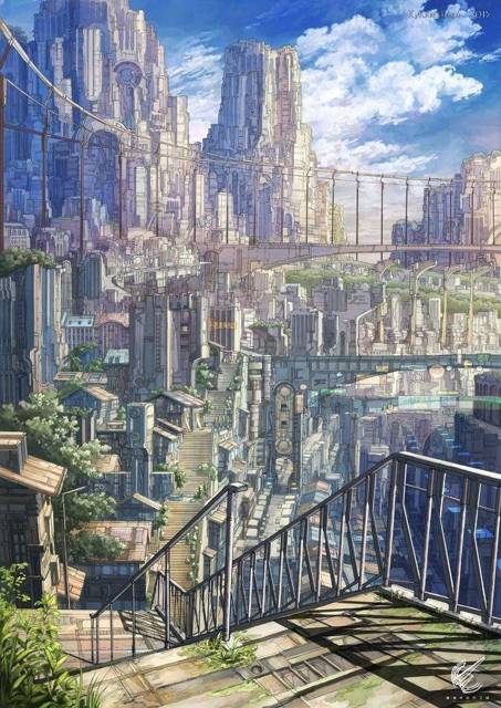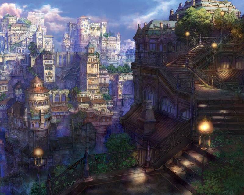 Окружённый высокой каменной стеной, этот город сочетал в себе строительный камень, обработанное дерево и живую, яркую природу. Множество навесных мостов и лестниц соединяли между собой края и поверхности разных возвышенностей, на которых стояли районы города, а иногда и отдельные постройки. Там были и огромные каменные башни похожие на небоскрёбы, и целые комплексы зданий будто склеенные между собой, и даже небольшие деревянные домики или напротив – раскидистые крыши многоэтажных, похожих на японские храмы зданий. Всё это великолепие сияло и нежилось под лучами теплого солнца, утопая в окраинах множества парков и вкраплений островков насыщенно-зелёной растительности – будь то деревья или оградки подстриженных кустарников.
