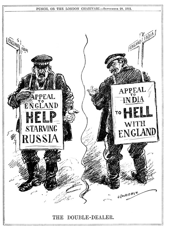 В Англии вызывала беспокойство внешняя политика Советской России. На другой карикатуре был изображен большевик с плакатом, часть которого была обращена к Англии и призывала помочь голодающим в России, а другая часть – к Индии, где написано «К черту Англию».