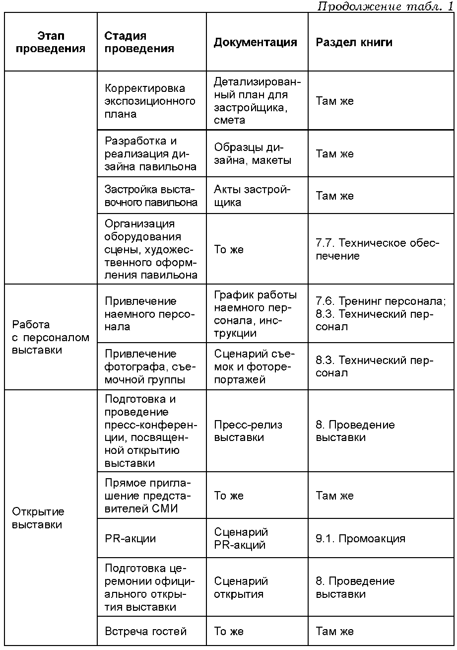 Материалы книги сгруппированы тематически, поэтому для удобства читателя ниже размещается таблица 1, представляющая собой нечто вроде «карты» издания. Данная карта располагает материалы книги в той последовательности, в которой естественным путем размещаются во времени этапы и стадии мероприятия, начиная от планирования и заканчивая демонтажом экспозиции.