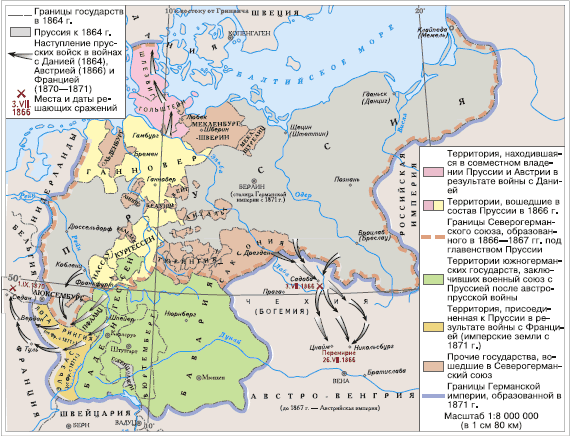 1. Немецкий экономист Фридрих Л ист (1789–1846) писал о вреде раздробленности Германии: «Ведя торговлю в Гамбурге с Австрией, в Берлине со Швейцарией, приходится проезжать через 10 государств, изучать 10 таможенных и местных порядков, уплачивать 10 раз принудительные пошлины… Немцы с завистью смотрят на великий народ, живущий по другую сторону Рейна, который ведет торговлю от Ла-Манша до Средиземного моря, от Рейна до Пиренеев, от границы Голландии до Италии, по свободным рекам и дорогам, не встречая ни одного таможенного чиновника». Изменилось ли что-либо в этом пагубном положении (речь идет о 1830-х гг.) ко времени австро-прусской и франко-прусской войн? Если изменилось, то что именно?