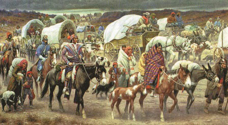 Индейцев насильно вывозят в резервации – специально отведенные для них территории. Художник Р. Линде