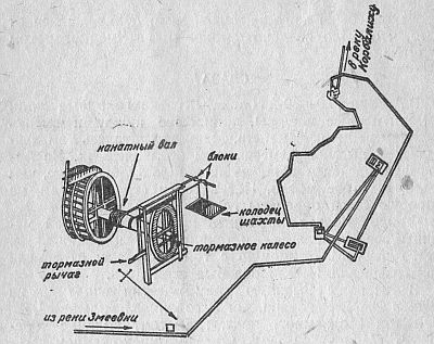 Мы шли вперед, повеяло свежестью и вскоре послышался шум, подобный происходящему от мельничных колес. Закончился коридор, и мы вышли в каменный дворик; в одной стороне его мы увидели огромное колесо до 7 сажен в диаметре, служащее для отливания воды из рудника. К концу оси колеса были прикреплены членосоставные рычаги, длиною в 40 сажен, с помощью которых поднималась вода. Дальше вода выливалась в бассейн, откуда другими насосами поднималась еще выше. Несколько человек занимались перекаткой руды на тачках к Екатерининской шахте, накладывали руду в подъемные бадьи. Подъем был устроен так, что одна бадья поднималась и канат навивался на вал ворота, а другая в то время свивалась с оного и опускалась вниз. Другие рабочие осьмигранным, наподобие длинного и толстого гвоздя, инструментом буравили в крепкой, из рогового камня состоящей породе скважины (шпуры), глубиной в 12 вершков. Каждый рабочий обязан был пробить в день два шпура; по окончании буравления сделанные отверстия набивались порохом и замазывались глиной. В глину через небольшое отверстие вставлялась камышовая тростинка, набитая порохом, она зажигалась после фитилем. Происходил взрыв, и значительная часть каменной стены, разбитая в куски, отваливалась. Многие работы на руднике производились» гидравлическими машинами. Вода, действуя на колеса, служила как для выливания накапливающейся в руднике воды, так и для движения рудоподъемных колес и промывания измельченной руды».