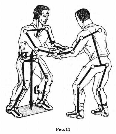 Психофизическое состояние. При сохранении собственной мобильности и динамической устойчивости необходимо уделить особое внимание ощущению контроля над центром тяжести противника, так как в этой ситуации он находится на границе потери устойчивости. Начало нарушения его устойчивости может сопровождаться резким ускорением тела противника, что может привести к срыву контроля над ситуацией. Положение собственного тела субъективно ощущается как «накопление» сил, «заряженность», как упругое сжатие собственного тела подобно объемной часовой пружине, готовность активно действовать в следующий момент времени в любом направлении пространства.