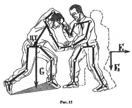 В исходном положении противник является устойчивой системой. Нарушение его равновесия начинаем путем выведения проекции вектора массы тела G за границы площади опоры, предварительно ограничивая степени подвижности суставов противника путем их проворота в соответствующих осях, таким образом создавая из тела жесткую конструкцию и используя ее наподобие рычага. Дополнительно прилагаем силы F1 и F2, способствующие созданию опрокидывающего момента (рис. 12). В момент начала потери устойчивости противником военнослужащий начинает освобождаться от захвата и, перехватывая инициативу, сам осуществляет захват его предплечий в целях дальнейшего управления его движениями.