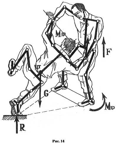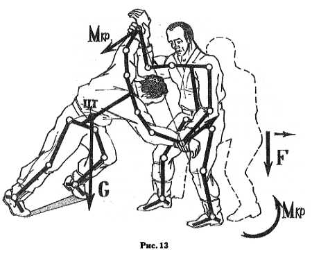Управляя телом противника через созданные жесткие связи в его суставных сочленениях, продолжаем выведение проекции вектора массы тела G за границы площади опоры, одновременно увеличиваем опрокидывающий момент с добавлением крутящего момента Мкр за счет поворота собственного тела. Также усиливаем воздействие, добавляя Мкр, через плечевой пояс противника в районе захвата его предплечий, постоянно увеличивая плечо этой пары сил (рис. 13). Следует отметить, что постоянным требованием остается принцип экономии собственных сил. Выполнение приема предполагает свои действия, суммирующие свои усилия с векторами сил противника, а не противодействующие им.