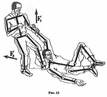 В результате совокупности перечисленных действий, опрокинув противника, прилагая усилия F1 и F2, проводим эффективное завершающее техническое действие, в данном случае – удар ногой в основание черепа (рис. 15).