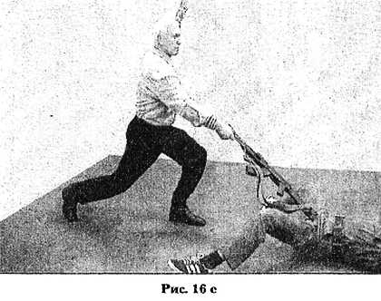 Биомеханический аспект элементов технического действия. Осуществив захват оружия путем создания плотного контакта пальцев кисти со стволом автомата, потянуть оружие на себя с проворотом вдоль его оси, выбирая при этом степени подвижности противника в его суставах путем их скручивания и создавая из него жесткую конструкцию, практическое подобие рычага. Затем, суммируя векторы силы противника со своими, увеличиваем плечо этого рычага и, нагружая конец оружия собственной массой, создаем опрокидывающий момент, действующий на противника. В целях повышения эффективности действия опрокидывающего момента необходимо воздействовать на центр тяжести противника таким образом, чтобы вектор массы смещался к краю опорной площадки по кратчайшему пути (в рассматриваемом нами случае вектор массы необходимо смещать к наружному краю левой стопы противника). Разлагая общее движение атаки по плоскостям клина, сначала по левой стороне собственного тела, одновременно другой рукой создаем вращательное движение относительно оси оружия при постоянном увеличении плеча рычага.