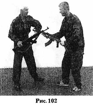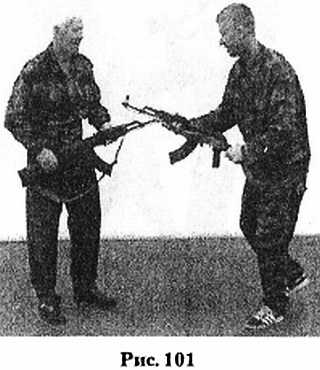 Делая смещение своего корпуса шагом влево, начинаем проворачивать автомат вокруг оси за магазин, усиливая воздействие на оружие противника и не мешая его общему движению (рис. 102).
