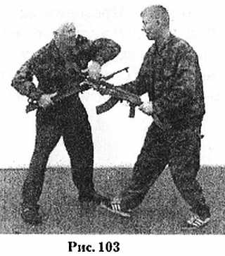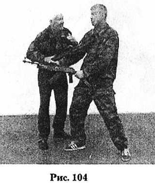 В этот момент проводим тычковый удар стволом своего автомата (рис. 104),