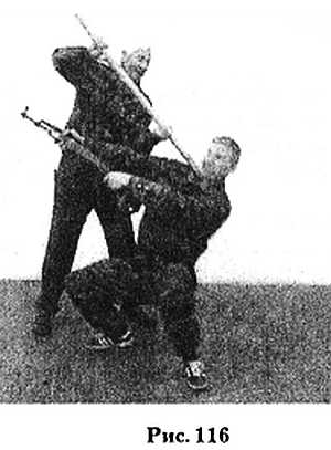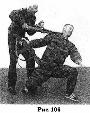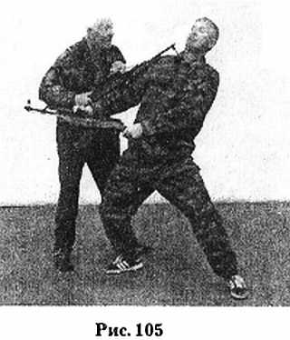 затем, сделав шаг за его спину и сохраняя контроль скольжением оружия вдоль его правой руки как направляющей, начинаем комплексное силовое и моментное воздействия в целях нарушения равновесия противника (рис. 105).