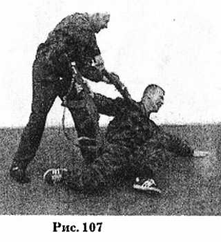 а действием опрокидывающего и крутящего моментов окончательно нарушаем равновесие и приводим противника в положение, позволяющее травмировать его коленный сустав (рис. 107).