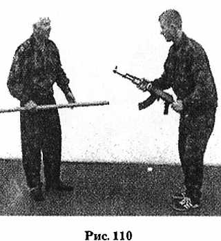 I фаза. Ситуация использования палки при защите от атаки противника прямым ударом автомата (рис. 110). Требование к своему психофизическому состоянию аналогично требованиям в рассмотренных выше ситуациях угроз и атак оружием.