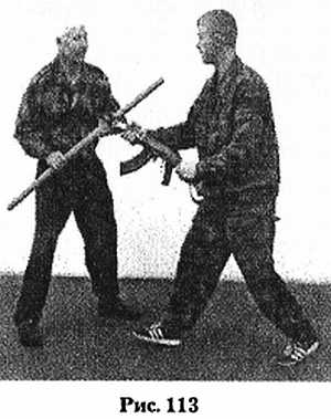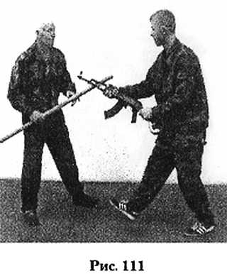 II фаза. При начале атаки противника, создавая «внутреннее» движение по всем звеньям тела, выравниваем скорость движения своего корпуса с подручным предметом (палкой) с вектором скорости движения ствола автомата противника. Шагом влево смещаем свой корпус и обеспечиваем вход в плоскость атаки, проведя мягкий контакт с оружием противника с помощью палки по касательной плоскости в целях разложения сил противника (рис. 111).