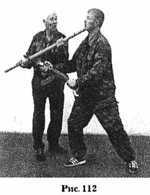 Продолжая смещать свою массу на левую ногу и усиливая воздействие на оружие противника вращением палки, не мешаем общему движению его атаки и заставляем сделать шаг правой ногой в целях проведения балансировки для поддержания устойчивости (рис. 112).