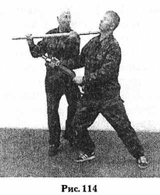 Используя силу реакции от опоры своей левой ноги и контролируя противника через контакт в зоне его предплечья, проводим атаку его горла палкой, используя ее как рычаг (рис. 114).