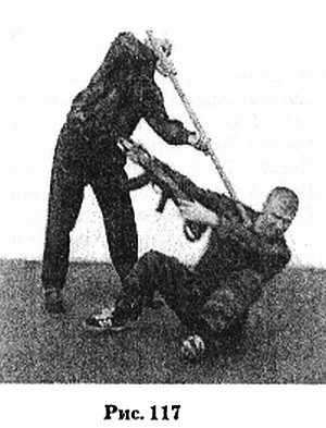 и окончательно опрокидываем противника, продолжая наносить травмирующее воздействие в область его горла (рис. 117).