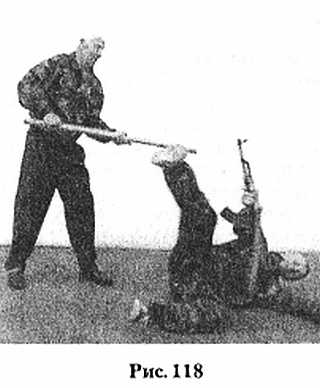 В момент потери противником своего равновесия проводим удары палкой в целях повреждения его коленного и голеностопного суставов (рис. 118).