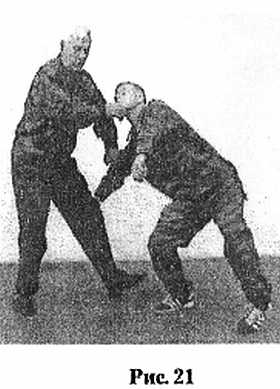 Дополнительно проводим удар правой рукой в область шеи. Вектор удара правой рукой и силовое воздействие левой рукой создают пару сил, образующую крутящий момент относительно оси позвоночника противника (рис. 21).