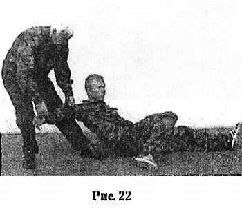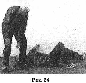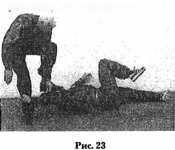 Сохраняя постоянный контроль над телом противника, вытягиваем его вдоль оси тела и подготавливаем завершающий удар (рис. 23).