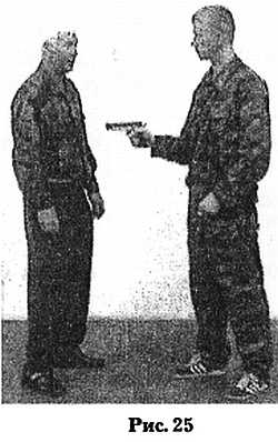 I фаза. Ситуация угрозы противника пистолетом аналогична ситуации в варианте 1, поэтому все основные требования, характерные для этого варианта, соблюдаются и для варианта 2 (рис. 25).