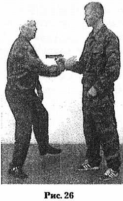 II фаза. Смещая массу тела на правую ногу, уходя с линии выстрела как с направления вектора воздействия, ребром правой руки проводим короткий и хлесткий удар в лучезапястный сустав противника. Форма удара является петлеобразной и напоминает «запятую», глубина пробива не более полутора характерного размера объекта атаки – полтора максимального диаметра суставного сочленения (рис. 26).