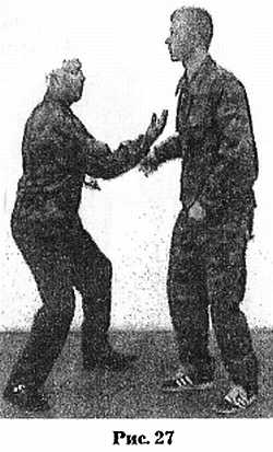 Выбив оружие, подготавливаем атаку ребром ладони уязвимого места противника, в конкретной ситуации – его горла, постоянно осуществляя контроль за возможными его перемещениями (рис. 27).