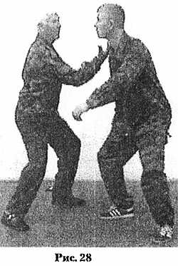 Проведя удар в горло и не разрывая контакта с зоной атаки в целях сохранения контроля, нагружаем тело противника вдоль оси его позвоночника (рис. 28).