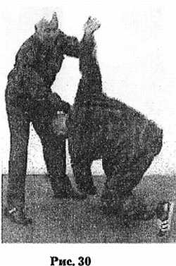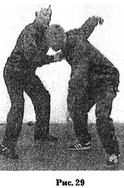 Затем наклоняем его корпус вперед для смещения проекции его вектора массы к краю площади опоры. Левой рукой захватываем правую руку противника в целях создания пары сил «горло – правая рука» (рис. 29).