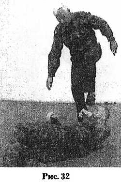 III фаза. Наносим ногой завершающий удар в область головы таким образом, чтобы окончательно разрушить противника как систему (рис. 32).