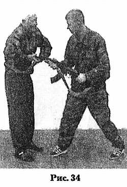 Отбор проводится путем создания согласованного крутящего момента корпуса собственного тела защищающегося и оружия как рычага относительно кисти противника, удерживающей автомат за приклад (рис. 39).