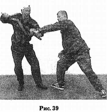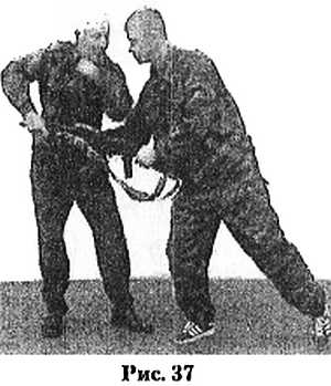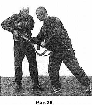 Удар в локтевой сустав противника служит не только для нанесения ему повреждения, но и для создания дополнительного импульсного крутящего момента относительно оси его позвоночника в целях управления телом противника как целостной системой (рис. 37).