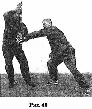 Кроме этой цели крутящий момент создает ограничение степеней подвижности в суставах руки противника, удерживающей оружие, и позволяет через образовавшуюся жесткую конструкцию продолжать нарушение равновесия биомеханической конструкции тела противника (рис. 40).