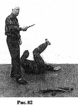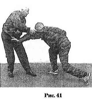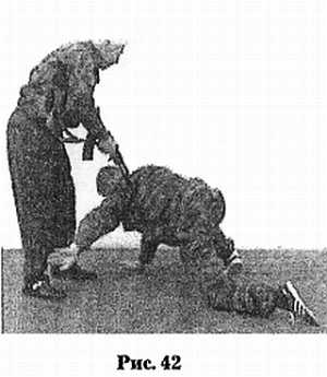 Окончательно нарушаем равновесие противника и опрокидываем его с помощью отобранного оружия, одновременно подготавливаемся к нанесению завершающего удара (рис. 41).
