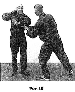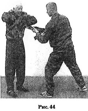 II фаза. Так же, как и в предыдущей ситуации, необходимо создать незаметное для противника предварительное «внутреннее» движение по всем звеньям тела в целях подготовки внезапной контратаки. Шагом правой ноги назад обеспечиваем уход с линии атаки в ее вертикальной плоскости, так как при таком виде атаки возможно ее развитие в вертикальное рубящее движение. Создавая мягкий контакт предплечьями с оружием противника одновременно с легким их проворотом в зоне контакта, как и в вышеописанной ситуации, начинаем разлагать силу атаки противника на ее составляющие (рис. 44).