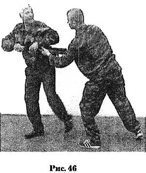 Мягко и плотно захватывая оружие, удлиняем плечо опрокидывающего рычага, действующего на противника через автомат, путем переноса массы собственного тела на правую ногу. Таким образом, увеличение рычажной нагрузки приводит к сковыванию противника и уменьшению степени подвижности его тела, а это позволяет осуществлять надежное управление его биомеханической конструкцией. Движение переноса массы тела защищающегося на правую ногу разгружает его левую ногу для подготовки удара в руку противника, держащую приклад автомата (рис. 46).