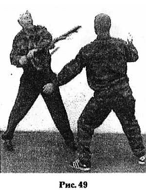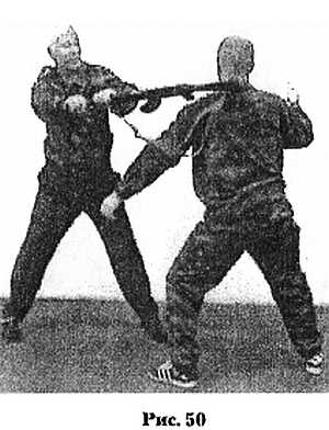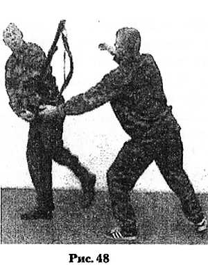 Вращение оружия, поворот корпуса тела защищающегося и удар создают дополнительный крутящий момент, приложенный к телу противника и ухудшающий устойчивость его конструкции. Балансом свободных частей собственного тела обеспечиваем положение отобранного оружия как можно ближе к своему корпусу (рис. 48).