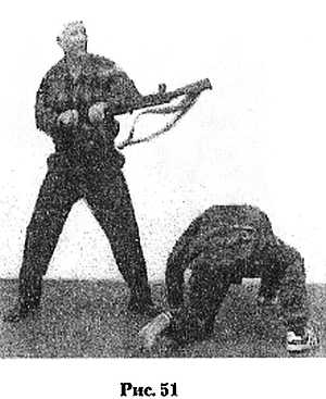Удар наносится в затылочную часть шеи противника таким образом, чтобы передать суммарную энергию своего движения и реактивной силы через автомат как рычаг, имеющий ось вращения вокруг нашего левого предплечья и в результате окончательно нарушить равновесие противника (рис. 50).