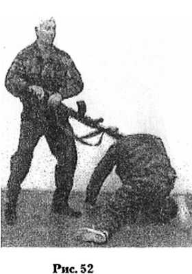 III фаза. Наносим завершающий удар в зону позвоночника противника, в легком приседании, суммируя массу тела с массой и импульсом автомата как скоростного рычага (рис. 52).