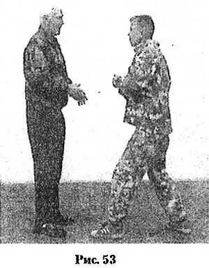 I фаза. Данная ситуация представляет собой попытку противника быстро нанести прямой удар правой рукой в верхний уровень защищающегося. Общие требования: мягкость и подвижность собственного тела, аналогично ранее рассмотренным ситуациям с оружием, позволяющие иметь запас движения в целях обеспечения быстрой и правильной реакции (рис. 53).