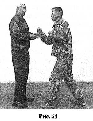 II фаза. Требование постоянного «внутреннего» движения по всей цепи тела является необходимым условием для всех последующих наших управляющих действий по отношению к противнику. В легком приседании, встраиваясь в плоскость удара, вбрасываем на траекторию вектора движения атакующей руки противника свою левую кисть, обеспечивая контакт с предплечьем противника (рис. 54). В дальнейшем через этот вращательно-скользящий контакт по предплечью и плечу мы будем ощущать любые его перемещения.