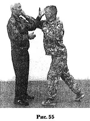 Переходя в этом контакте с кисти руки на предплечье, одновременно легким вращением вокруг оси собственного предплечья мы создаем разложение силы удара противника, не мешая общему движению противника (рис. 55),