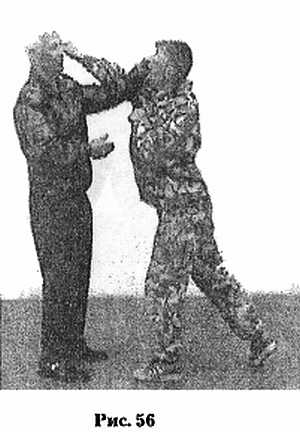 Встречное проникновение и достижение цели (головы противника) напоминает фехтовальную технику – быстрое «врезание» в его конструкцию обеспечивается тщательной предварительной подготовкой навыка мгновенного создания подобия клина при помощи своего тела и рук для обеспечения разложения силы удара противника. В момент контакта руки с головой противника после нанесения встречного удара, не разрывая контакта, начинаем скручивание тела противника путем приложения крутящего момента вокруг оси его позвоночника (рис. 57).