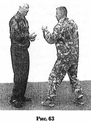I фаза. Данная ситуация представляет собой попытку противника нанести боковой удар левой рукой в голову защищающегося (рис. 63). Общие требования аналогичны требованиям в выше рассмотренной ситуации защиты от прямого удара рукой.
