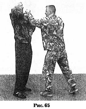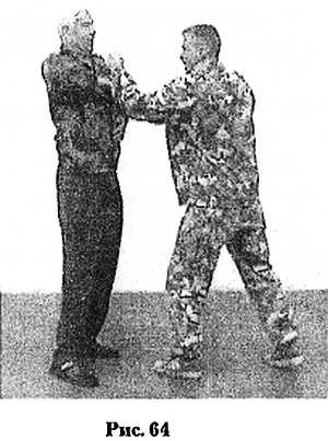 В контакте с предплечьем противника с одновременным согласованным движением своего корпуса создаем направляющую поверхность вдоль поверхности своей кисти и начинаем разложение силы удара противника, не мешая его общему движению (рис. 65).