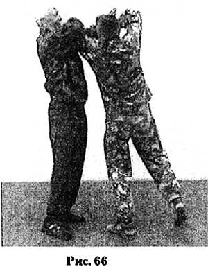 Суммарное воздействие подъемной силы и крутящего момента резко ухудшает условия устойчивости противника из-за переноса массы его тела на левую ногу, кроме того степени подвижности его суставных сочленений резко уменьшаются и возрастает общая жесткость структуры тела, что фактически превращает все его тело в подобие рычага (рис. 67).